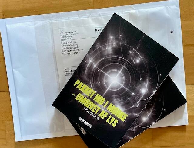 Mens jeg føler mig lidt kongelig, pakker jeg to eksemplarer af udgivelsen i en boblekuvert og hæfter pakkelabel på. Sådan en får man ovenikøbet til hver udgivelse med ISBN-nummer. Så slipper jeg for at betale portoen, hvilket ville sende mit regnskab direkte i minus. Når jeg først har bøvlet med printeren, plastiklomme og pakketape, kommer dopamineksplosionen i det sekund, jeg limer kuverten sammen og gør den klar til drop-off.